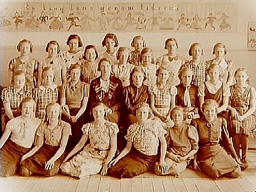 Holmens skolan, klassrumsinteriör, 25 flickor med lärarinna fröken Vilma Monö, klass 7, sal 4.