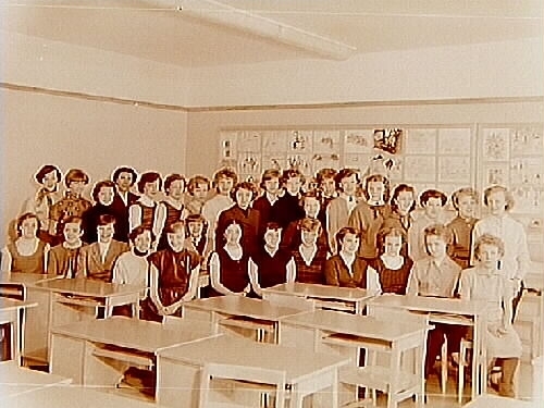 Olaus Petriskolan, klassrumsinteriör, 31 flickor med lärarinna fru Hildur Lien, klass 8b, lokal i Tullhuset, 3 trappor.