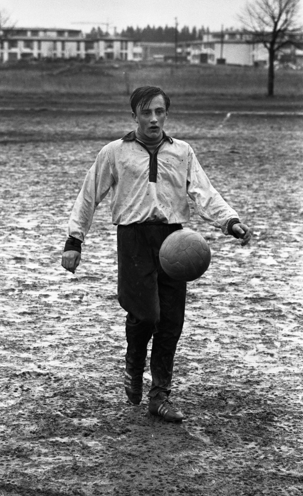 Fotbollsspelaren Anders Bäckström sparkar boll på Trängens fotbollsplan. Bakom honom ser man Oxhagens bostadsområde.