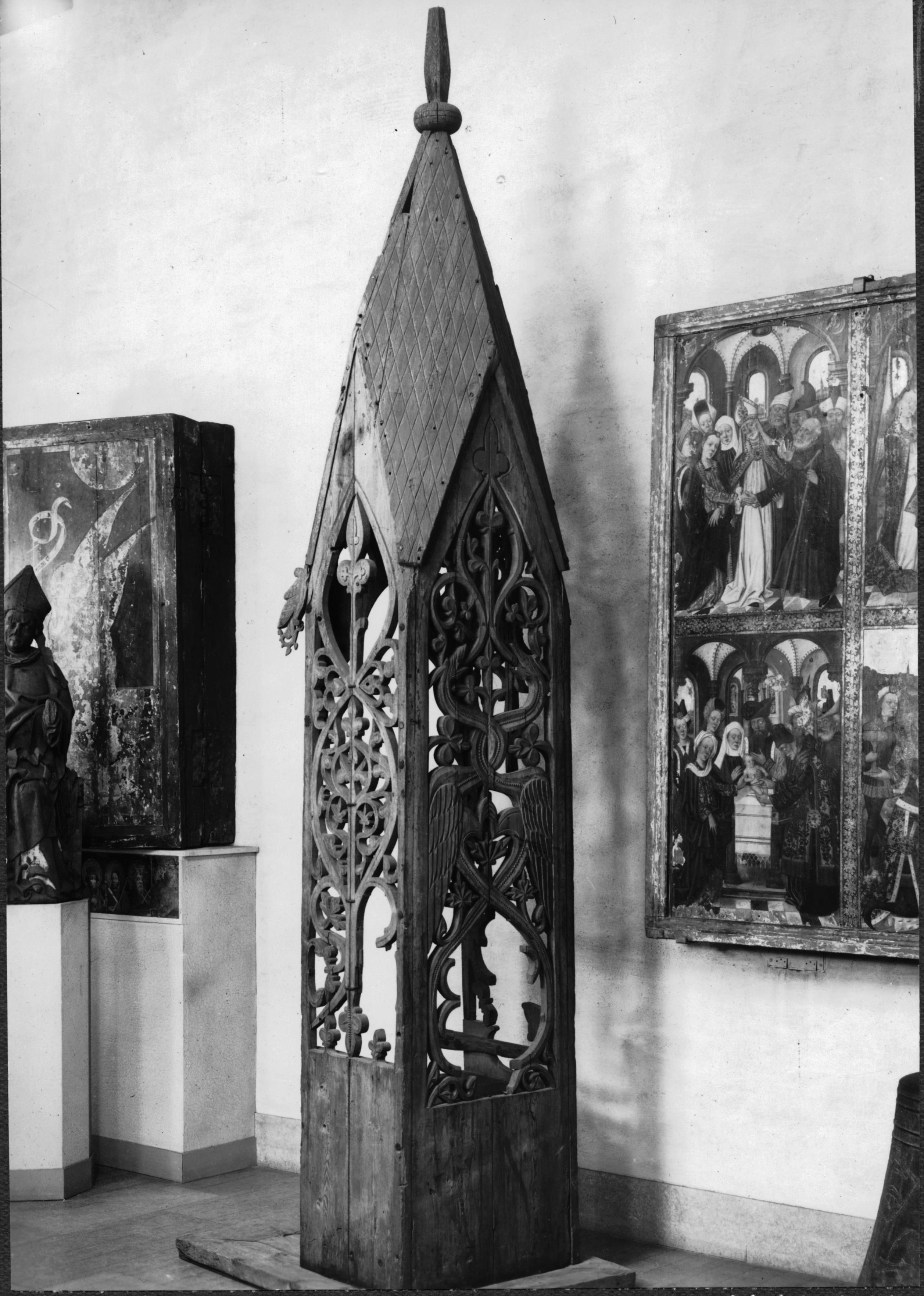 Beskrivning: Korstol av furu med rikt snidade gavlar, 1300-tal.