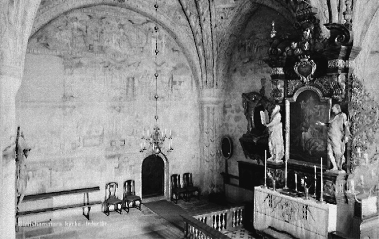 Glanshammars kyrka, interiör, altar och väggmålning.