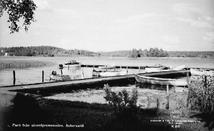 Askersund, parti från strandpromenaden, båthamnen med båtar.