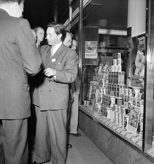 Gruppbild vid ett skyltfönster med Persil-tvättmedel.