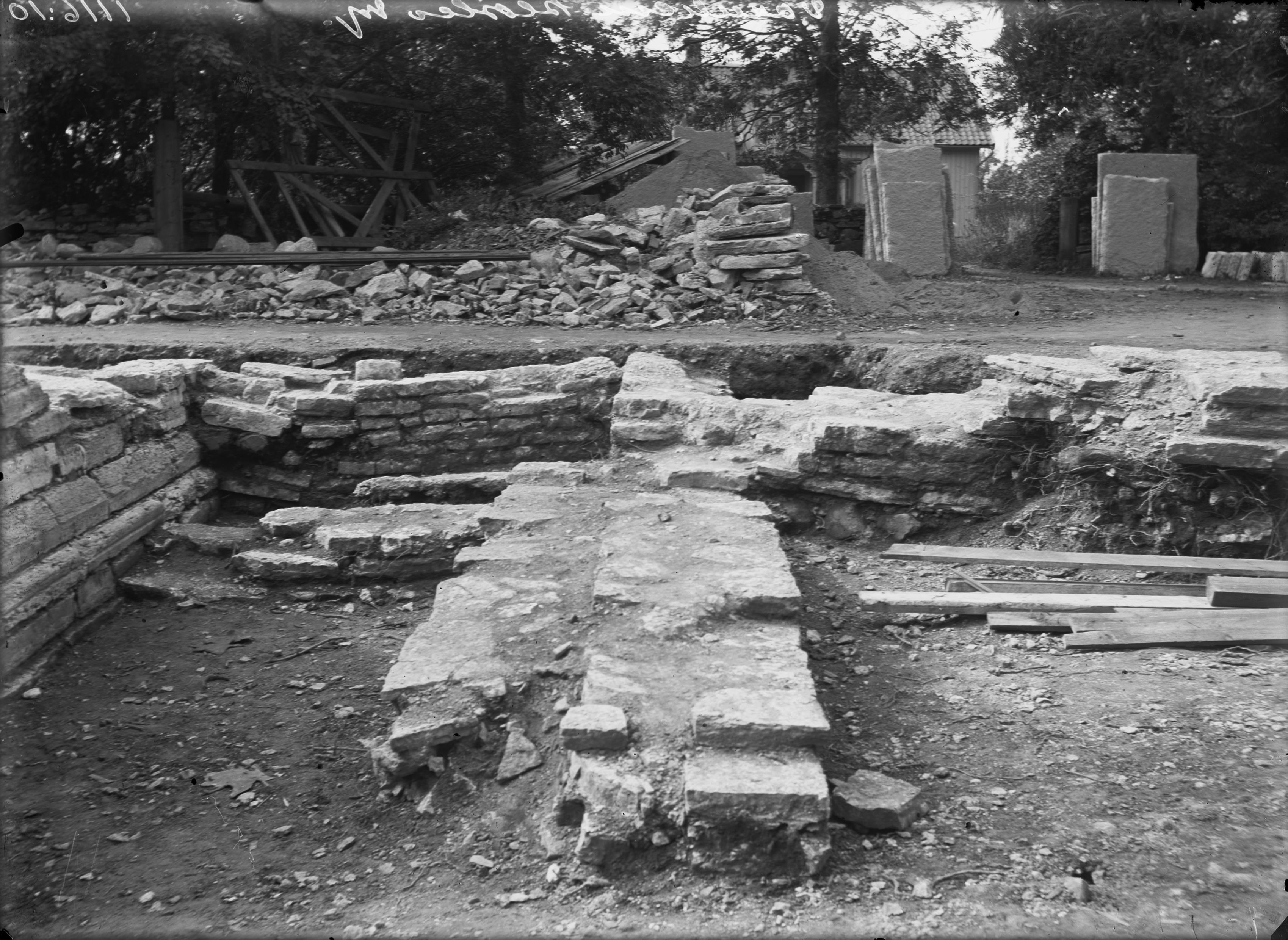 Klostermurar norr om västra längans norra sida. Längst till höger grunden till kyrkogårdsmur från 1600-talet. Från öster.