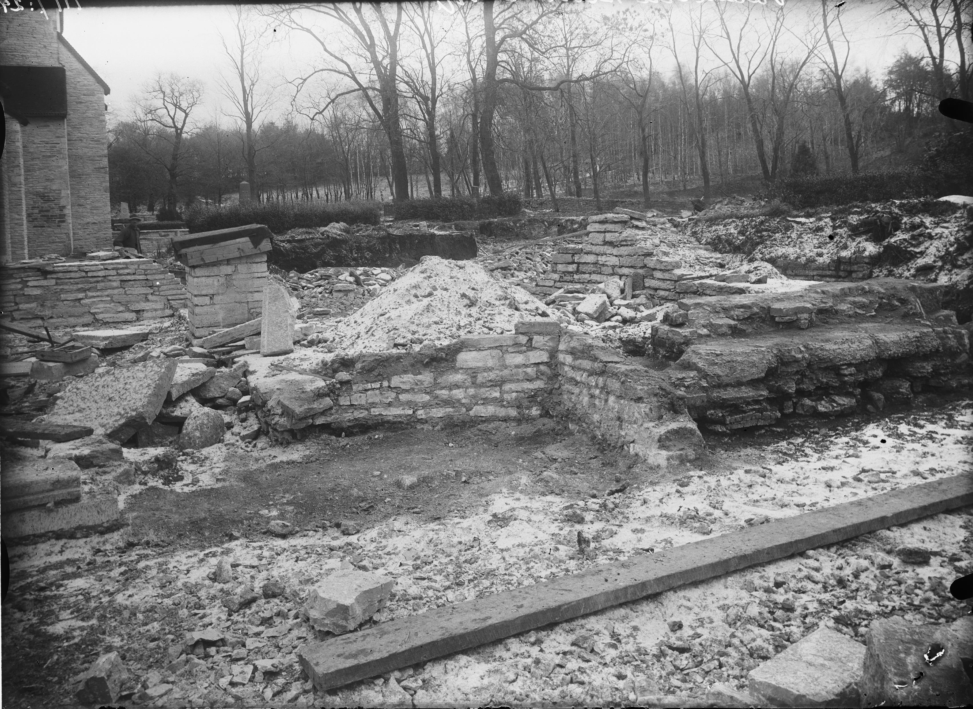 Västra längans västra fasad. Norra delen med i fasadmuren inbyggd kalkugn, sannolikt från 1600-talsarbetena. Från nordväst.