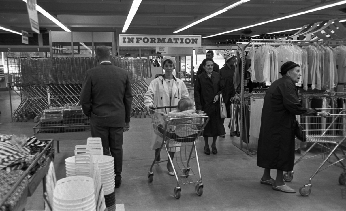 I mitten i förgrunden inne på Domus stormarknad går en kvinna med en kundvagn. I vagnen sitter ett litet barn. Bredvid kvinnan står en man i kostym. En äldre dam står till höger med en kundvagn. I bakgrunden syns ytterligare två personer: två kvinnor och en man. I bakgrunden uppe vid taket hänger en skylt med texten "Information." Metallstänger med galgar där det hänger blusar och kjolar till försäljning syns i bakgrunden, ett kundvagnsupplag samt i förgrunden plastkorgar till försäljning.