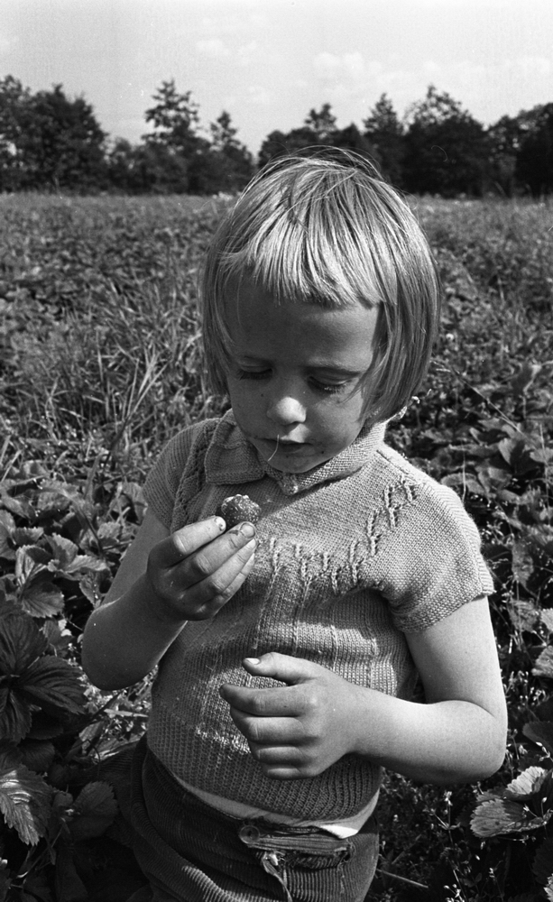 I förgrunden är en liten ljushårig flicka som håller en jordgubbe i sin högra hand och är klädd i en stickad sommartröja med korta ärmar. I bakgrunden skymtar jordgubbsfältet.