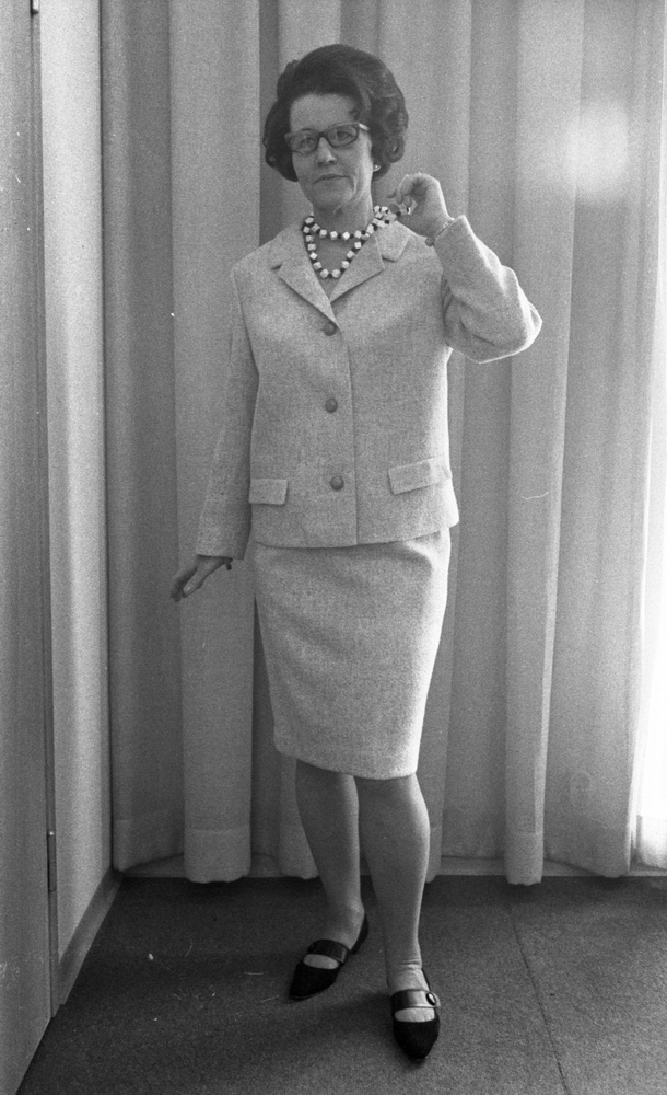 Närbild på en mannekäng i vit dräkt med kort kjol och svarta lågklackade skor med remmar på. Hon har ett pärlhalsband om halsen och håller upp sin vänstra hand i en pose i riktning mot halsen. Hon bär glasögon.
