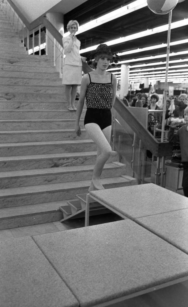 En fotomodell iklädd mönstrat linne, svarta trosor samt med svart hatt på huvudet är på väg uppför den lilla trappan som leder upp till catwalken. I bakgrunden i en trappa står en kvinnlig konferencier iklädd vit jacka, vit kjol samt vita skor och talar i en mikrofon.