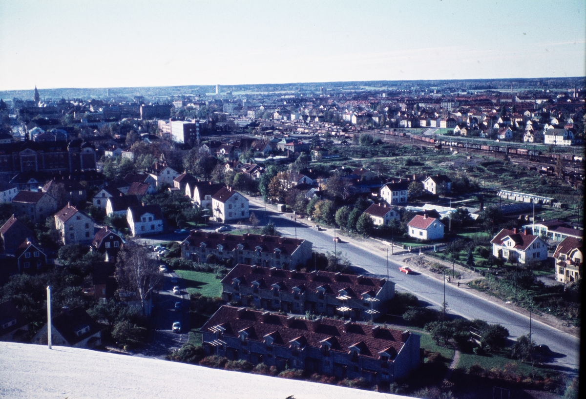 Utsikt från vattentornet Svampen. Hovstavägen. I mitten något vänster syns konfektionsfabriken Hagenfeldts.