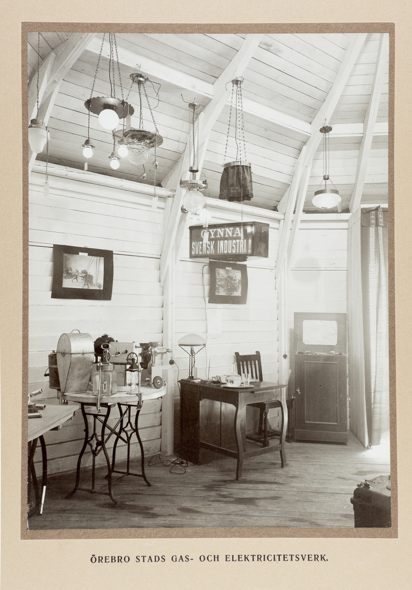 Titel: Industri- och slöjdutställning 21 juni - 16 juli 1911 i Örebro. Utsällningen hölls vid Karolinska läroverket och Livregementets husarers ridhus vid Olaigatan. Bilderna är samlade i en bok med riktika fotokopior. Ordförande för programkommittén var landshövding Theodor Nordström. Fabrikör Anton Hahn fungerade som närmaste man och vice ordförande. Med i styrelsen satt även stadsarkitekten Magnus Dahlander. Örebro stads gas och elektricitetsverk.