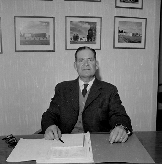 Titel: Kontorsinteriör, en man vid skrivbordet. Byggmästare Johan Andersson