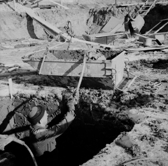 Byggnadsarbete, en man Handschakt för pålgrop i grunden.