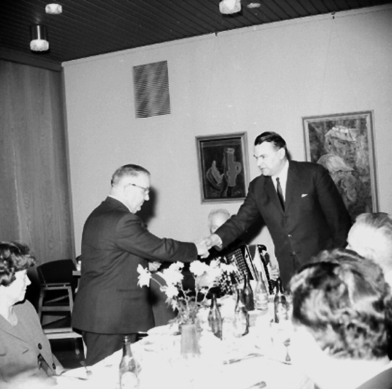 Rumsinteriör, grupp vid bordet. Personalklubben uppvaktar, Majgren avtackas.
