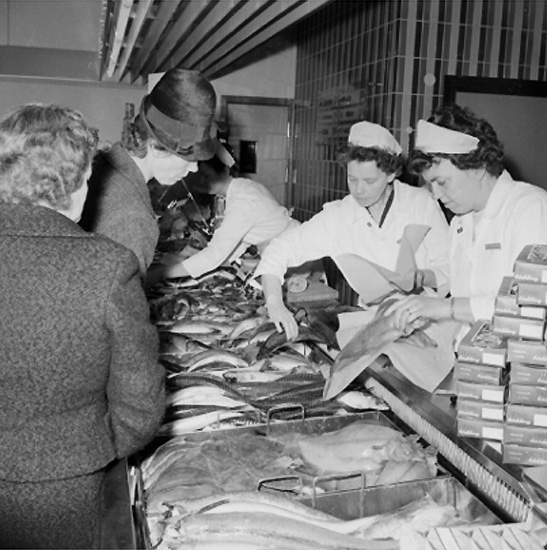 Konsum Domus, affärsinteriör, fiskdisken, kunder och personal.