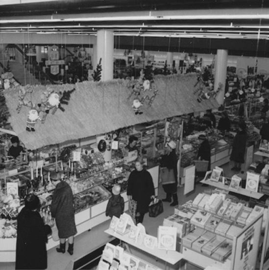 Konsum Domus stormarknad, affärsinteriör, kunder och personal.