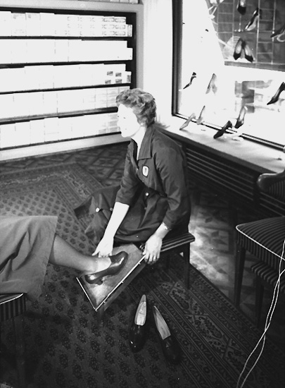 Titel: Oscaria skoaffär, interiör, skoprovning. Bilden tagen för annons.