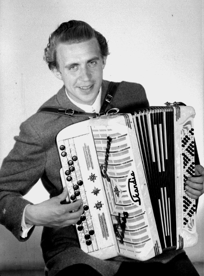 En man med musikinstrument (dragspel).