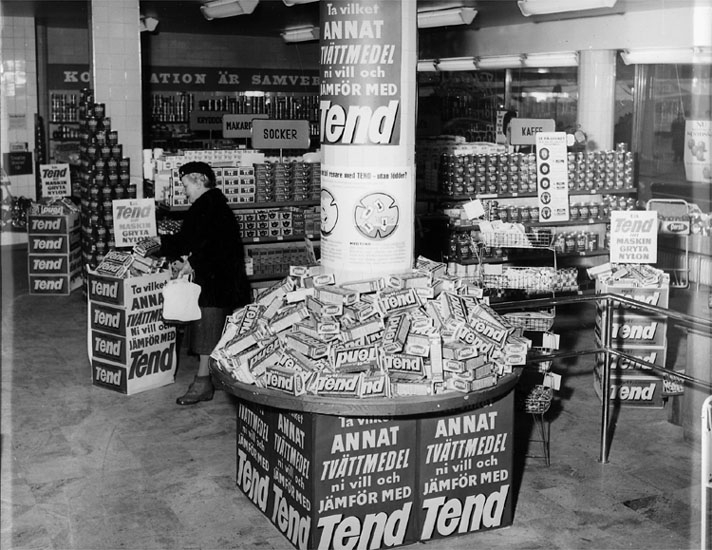 Konsum, affärsinteriör, tvättmedel Tend, en kvinna.