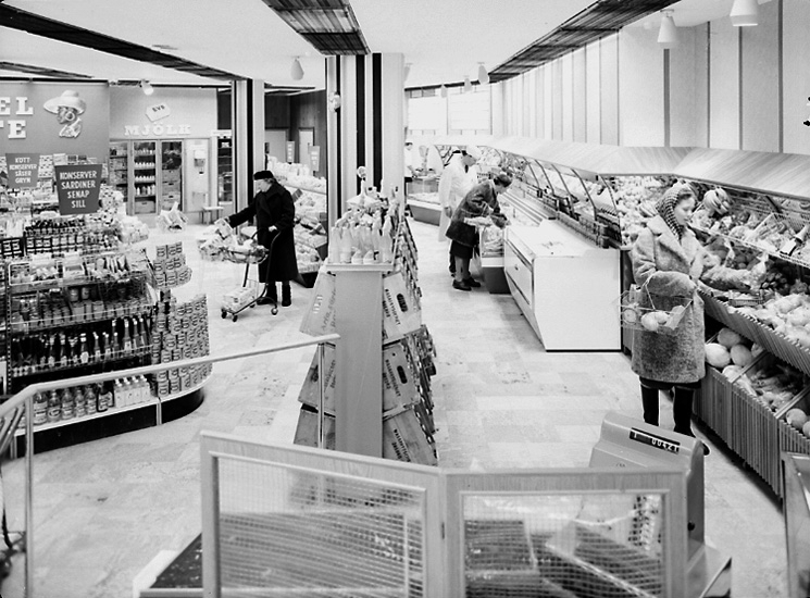 Konsum, affärsinteriör med personal och kunder.