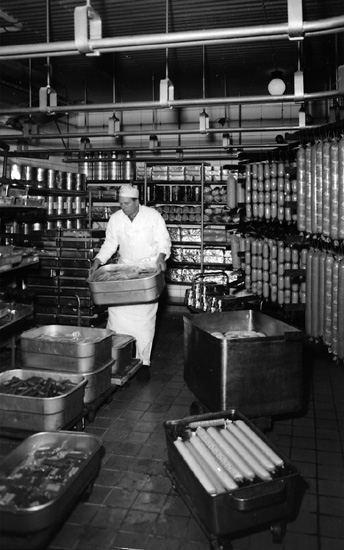 Konsum, charkuteriavdelningen, korvtillverkning, en man i kylrummet.