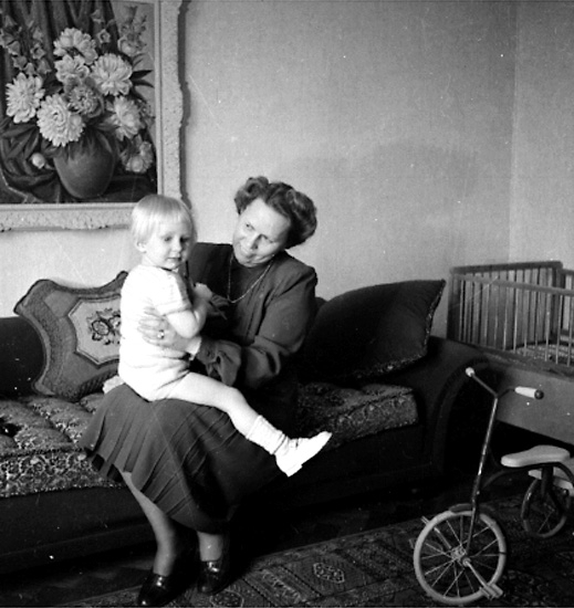 Titel: Rumsinteriör, en kvinna och ett barn. Fru Larsson
