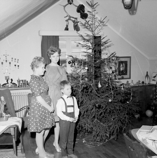 Rumsinteriör, familjegrupp tre personer vid julgranen.