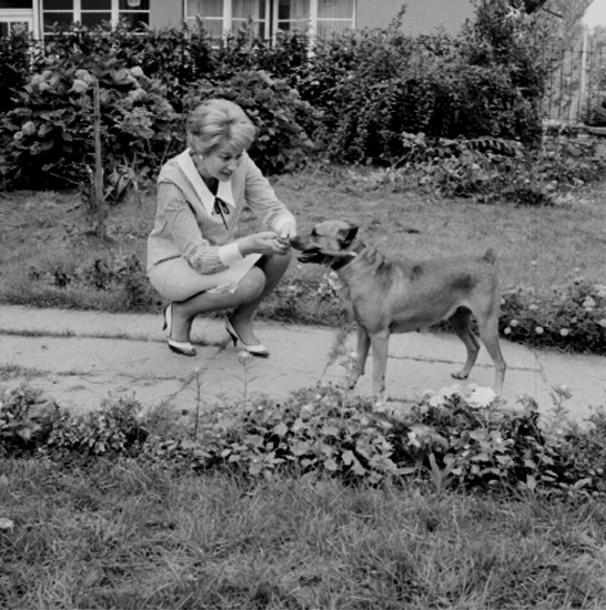 En kvinna och en hund. Bostadshus.