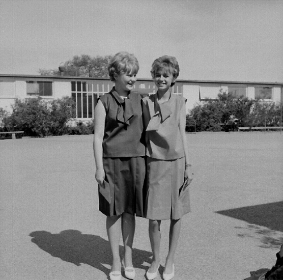 Två kvinnor. Skolbyggnad i bakgrunden.