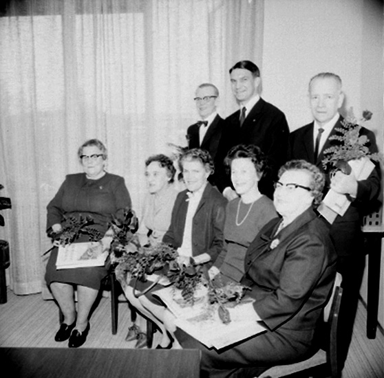 Rumsinteriör, grupp 8 personer, Kexens pensionärer. Personalklubben uppvaktar.