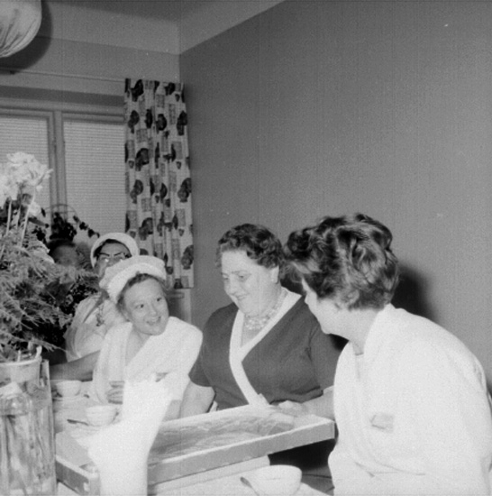 Titel: Rumsinteriör, grupp vid bordet, Kexens pensionärer. Personalklubben uppvaktar. Örebro Kexfabrik.