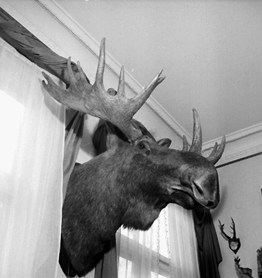 Rumsinteriör, älghuvud på väggen.