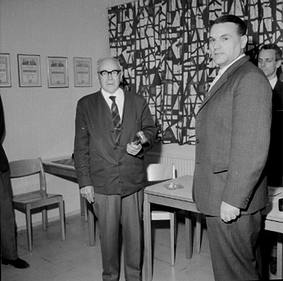 Rumsinteriör, tre män. "Schack-årsmöte".