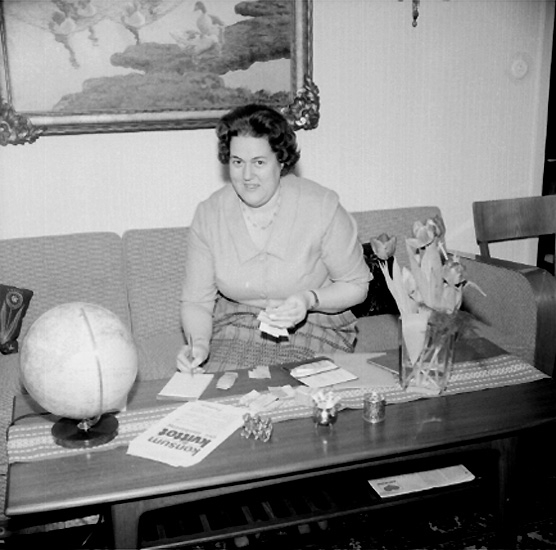 Konsums kvittoräkning, rumsinteriör, en kvinna.