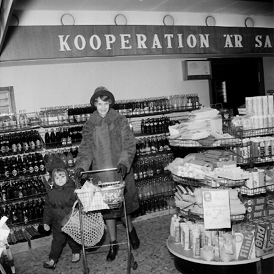 Konsum, affärsinteriör, en kvinna och en liten flicka.