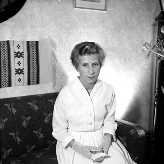 Titel: Rumsinteriör, en flicka, konfirmand. Stålberg