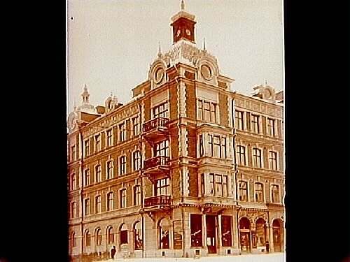 Stenhus i fem våningar med fasad i tegel och gul puts, balkonger och takspiror. Hörnfastighet, hörnet av Drottninggatan och Rudbecksgatan.