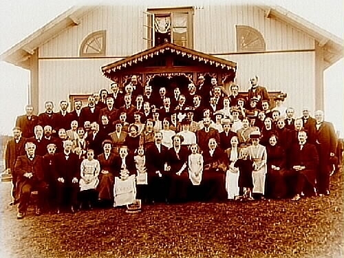 Brudpar och bröllopsgäster framför Gropens missionshus.