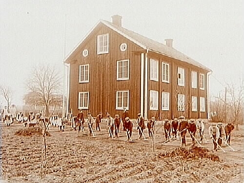 Lännäs skola, tvåvånings skolbyggnad, 28 skolbarn i trädgårdslandet.