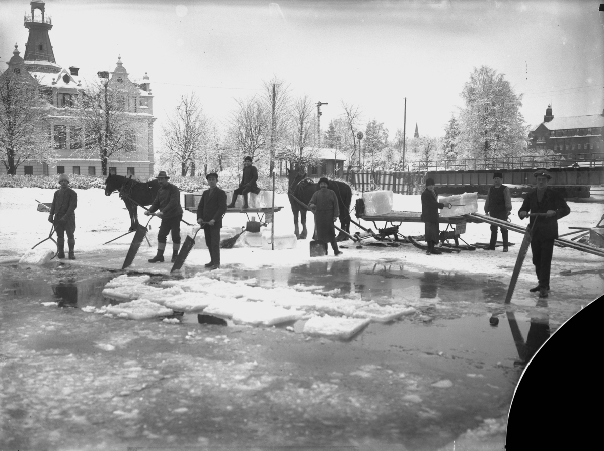3 män med issågar, 5 män med isstänger. 2 hästar med varsin flaksläde.