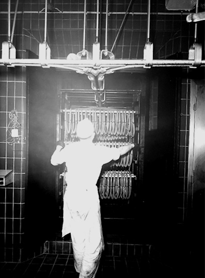 Konsums charkuterifabrik, interiör, korvrökning, en man.