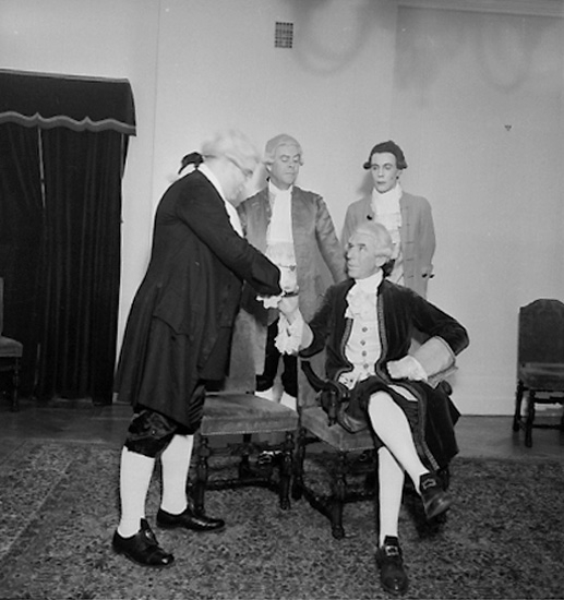 Rumsinteriör, maskerad, fyra utklädda personer.