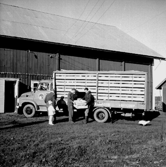 Stubbetorps Kontrollhönseri, lastbil och fyra personer.