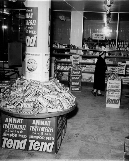 Konsum, affärsinteriör, tvättmedel Tend, en kvinna.