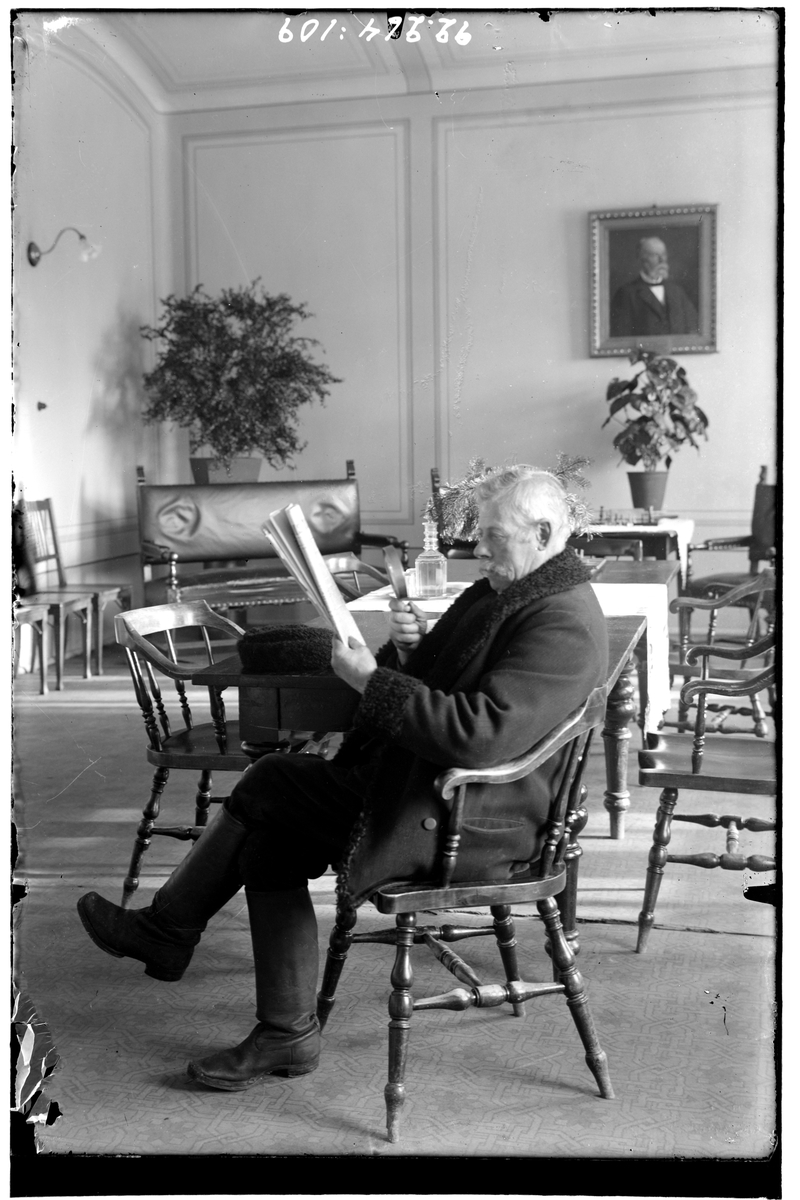 Hålahult sanatorium, interiör, gammal man sitter och läser tidningen med ett förstoringsglas, i matsalen? Klädd i vinterrock och läderstövlar