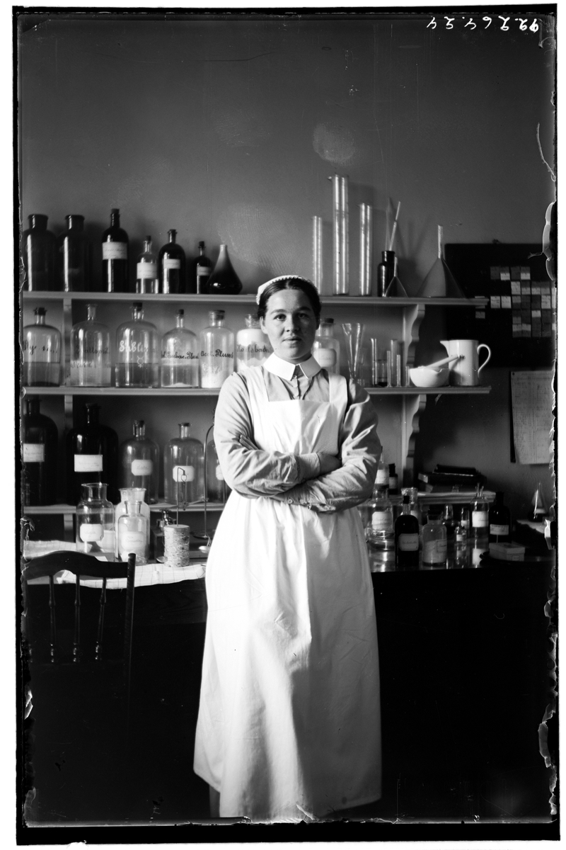 Hålhults sanatorium, interiör, labratoriemiljö, syster Rut Larsson.