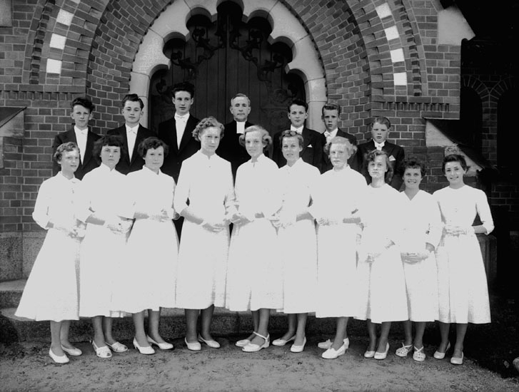 Konfirmander, tio flickor, sex pojkar och kyrkoherde Berndt Bäcklund.