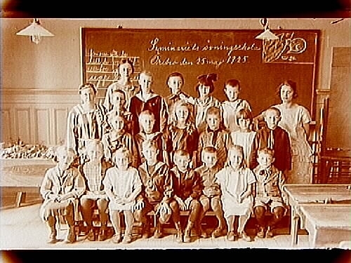 Seminarieskolan, klassrumsinteriör, 19 skolbarn med lärare.