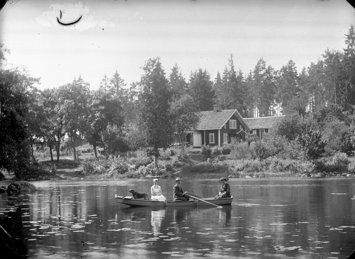 Tre personer och en hund i en roddbåt.