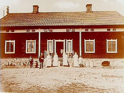 En och en halv vånings mejeribyggnad, 7 personer framför byggnaden.